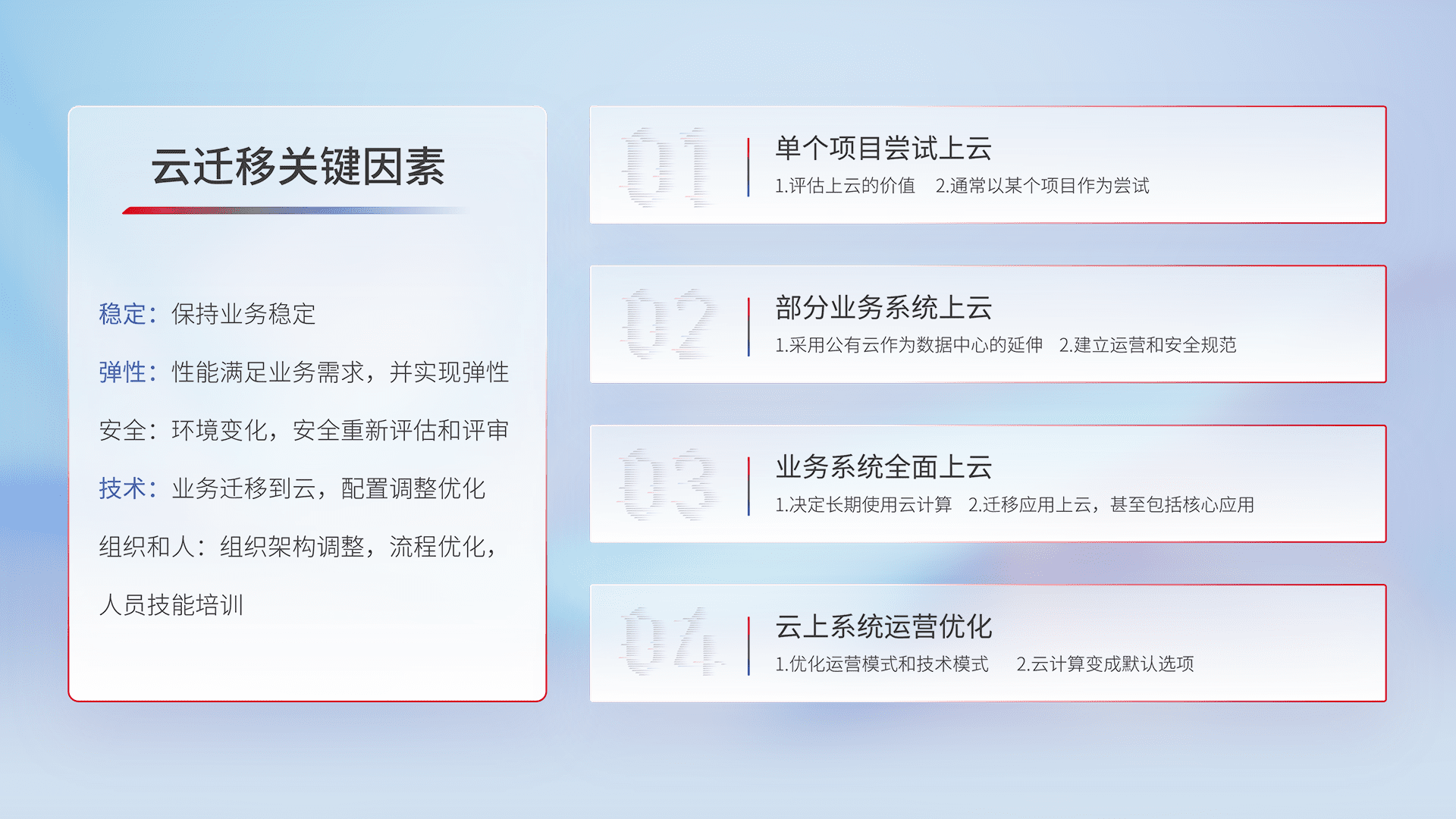 结合实际业务,,,从规划设计、、、云平台选型、、云原生改造、、、数据迁移、、集成交付,,,迁移全过程为客户识别最佳上云路径,,,做好风险识别管理,,设计网络架构、、、身份权限、、、、安全审计合规、、操作审计、、、、日志审计、、监控告警策略、、、、多站点容灾设计等,,对云上基础设施进行整体规划,,提升IT治理水平,,,以满足弹性、、高可用、、、、高性能的需求。。